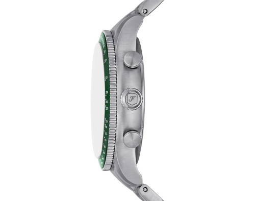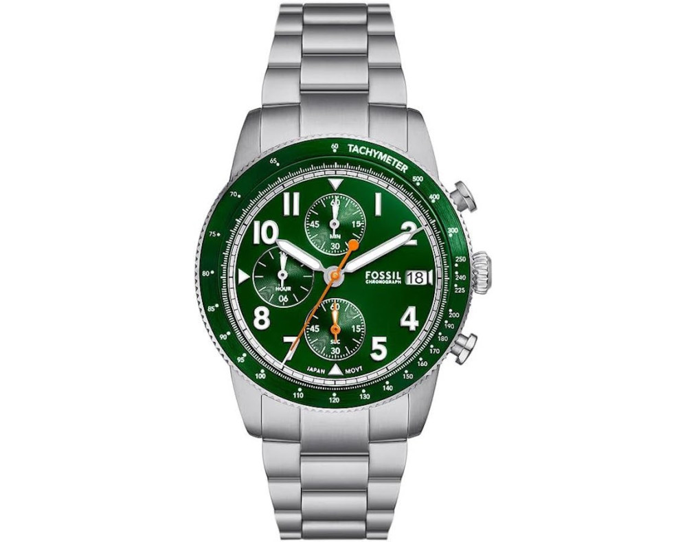 Armbanduhr Fossil Sport Tourer FS6048 für Herren mit Quarzwerk, Uhrengehäuse aus Edelstahl mit einem Durchmesser von 42 mm, Ziffernblatt Grün und Uhrenarmband aus Edelstahl in der Farbe Silber.