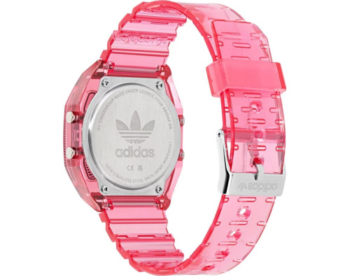 Armbanduhr Adidas Digital Two Crystal AOST25540 für Unisex mit Quarzwerk, Uhrengehäuse aus Resin mit einem Durchmesser von 36 mm, Ziffernblatt Pink und Uhrenarmband aus Resin in der Farbe Pink.