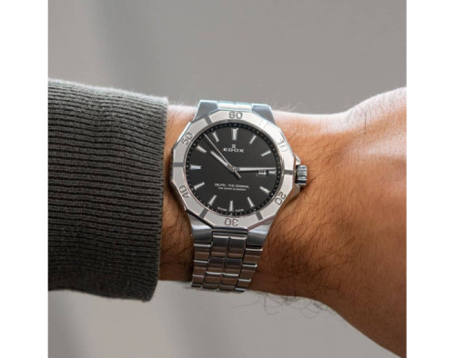 Armbanduhr EDOX Delfin The Original 53021 3M NIN für Herren mit Quarzwerk, Uhrengehäuse aus Edelstahl mit einem Durchmesser von 43 mm, Ziffernblatt Schwarz und Uhrenarmband aus Edelstahl in der Farbe Silber.