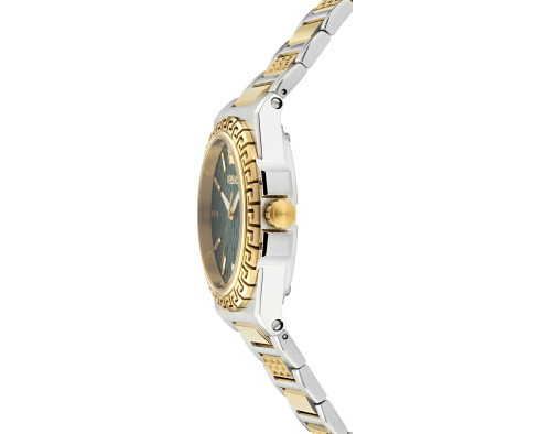 Armbanduhr Versace Greca Reaction VE0D00425 für Damen mit Quarzwerk, Uhrengehäuse aus Edelstahl mit einem Durchmesser von 38 mm, Ziffernblatt Grün und Uhrenarmband aus Edelstahl in der Farbe Zweifarbig.