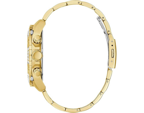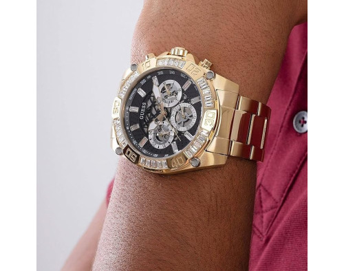 Armbanduhr Guess Trophy GW0390G2 für Herren mit Quarzwerk, Uhrengehäuse aus Edelstahl mit einem Durchmesser von 46 mm, Ziffernblatt Schwarz und Uhrenarmband aus Edelstahl in der Farbe Gold.