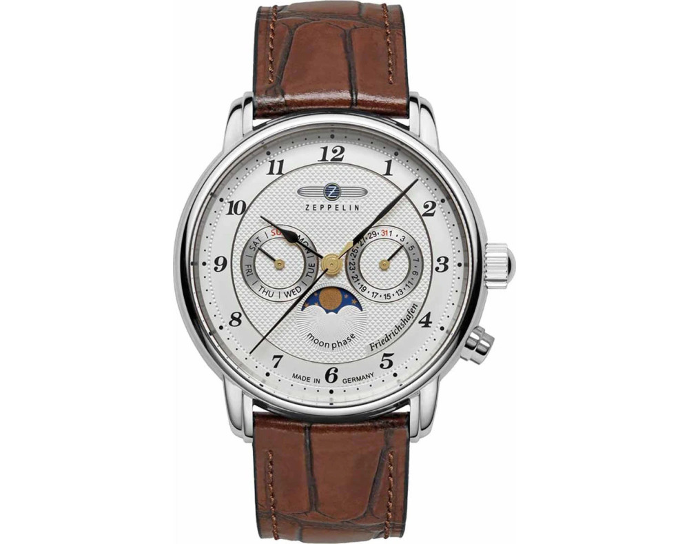 Armbanduhr Zeppelin Friedrichshafen 8536-1 für Herren mit Quarzwerk, Uhrengehäuse aus Edelstahl mit einem Durchmesser von 40 mm, Ziffernblatt Silber und Uhrenarmband aus Leder in der Farbe Braun.