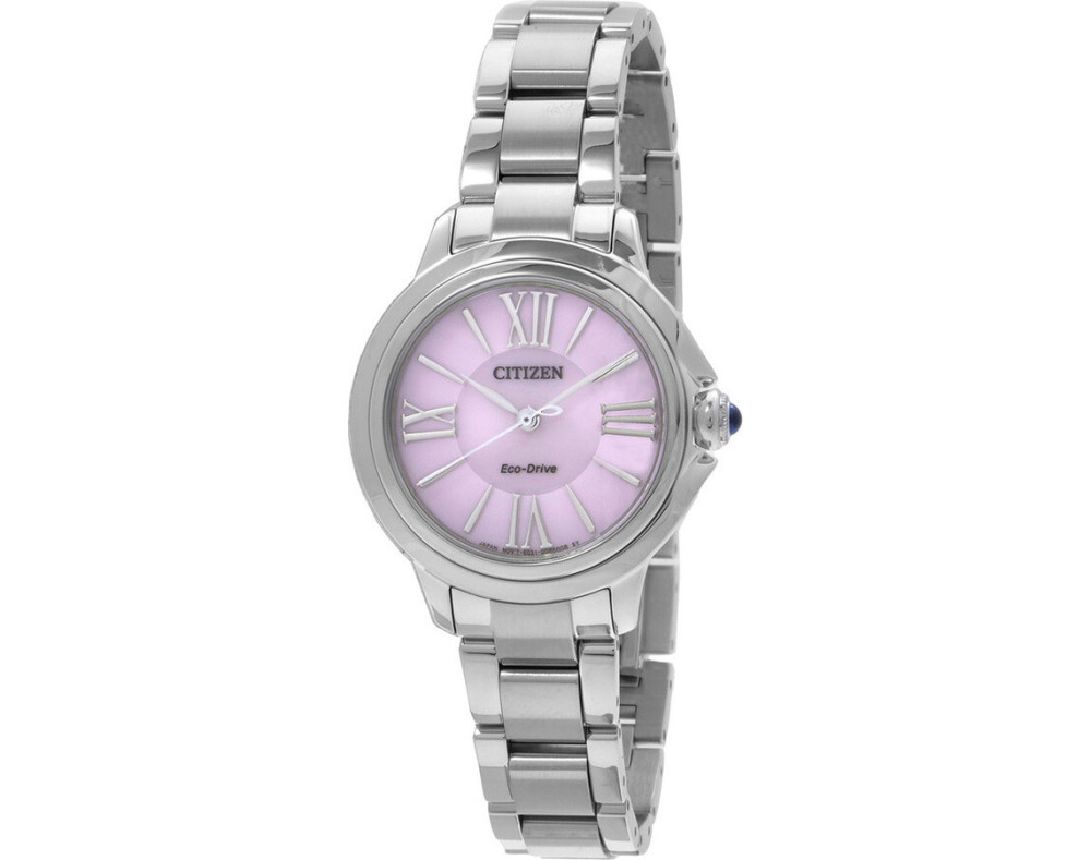 Armbanduhr Citizen Eco-Drive EM1160-58X für Damen mit Quarzwerk, Uhrengehäuse aus Edelstahl mit einem Durchmesser von 32 mm, Ziffernblatt Pink und Uhrenarmband aus Edelstahl in der Farbe Silber.