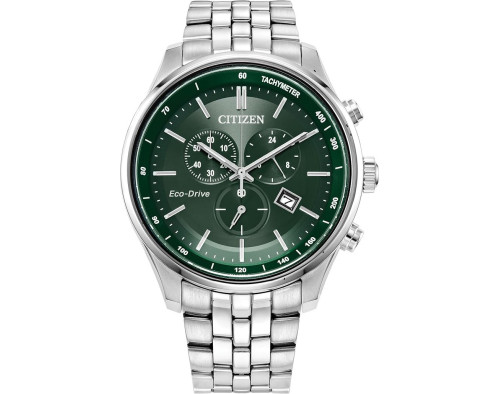 Armbanduhr Citizen Eco-Drive Sport CA0770-72X für Herren mit Quarzwerk, Uhrengehäuse aus Edelstahl mit einem Durchmesser von 43 mm, Ziffernblatt Grün und Uhrenarmband aus Edelstahl in der Farbe Silber.