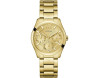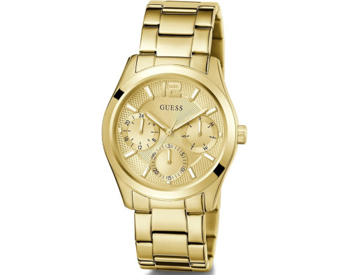 Armbanduhr Guess Zoe GW0760L2 für Damen mit Quarzwerk, Uhrengehäuse aus Edelstahl mit einem Durchmesser von 38 mm, Ziffernblatt Gold und Uhrenarmband aus Edelstahl in der Farbe Gold.