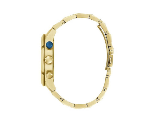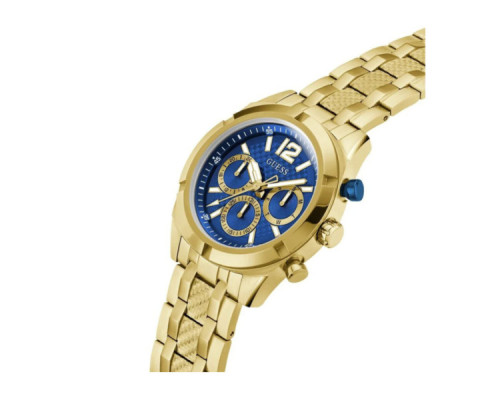 Armbanduhr Guess Resistance GW0714G2 für Herren mit Quarzwerk, Uhrengehäuse aus Edelstahl mit einem Durchmesser von 44 mm, Ziffernblatt Blau und Uhrenarmband aus Edelstahl in der Farbe Gold.