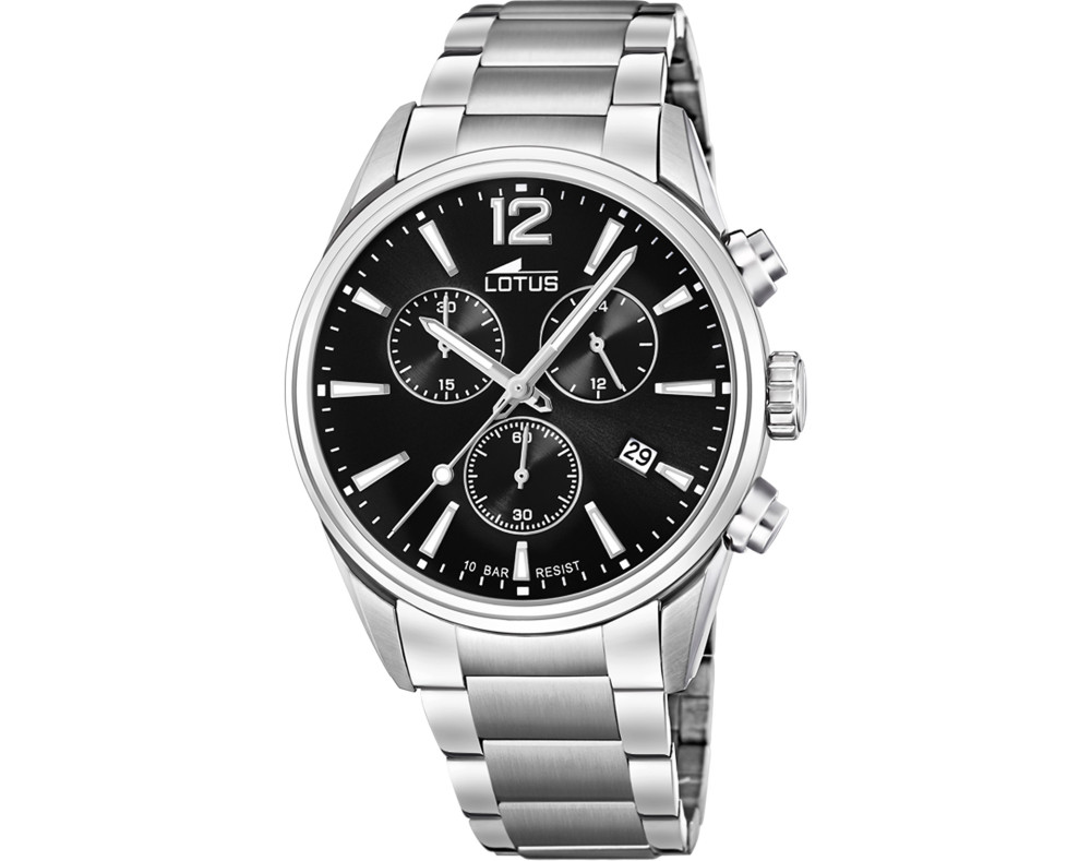 Armbanduhr Lotus 18690/3 für Herren mit Quarzwerk, Uhrengehäuse aus Edelstahl mit einem Durchmesser von 42 mm, Ziffernblatt Schwarz und Uhrenarmband aus Edelstahl in der Farbe Silber.