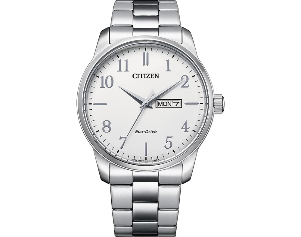 Armbanduhr Citizen Eco-Drive BM8550-81A für Herren mit Quarzwerk, Uhrengehäuse aus Edelstahl mit einem Durchmesser von 42 mm, Ziffernblatt Weiß und Uhrenarmband aus Edelstahl in der Farbe Silber.