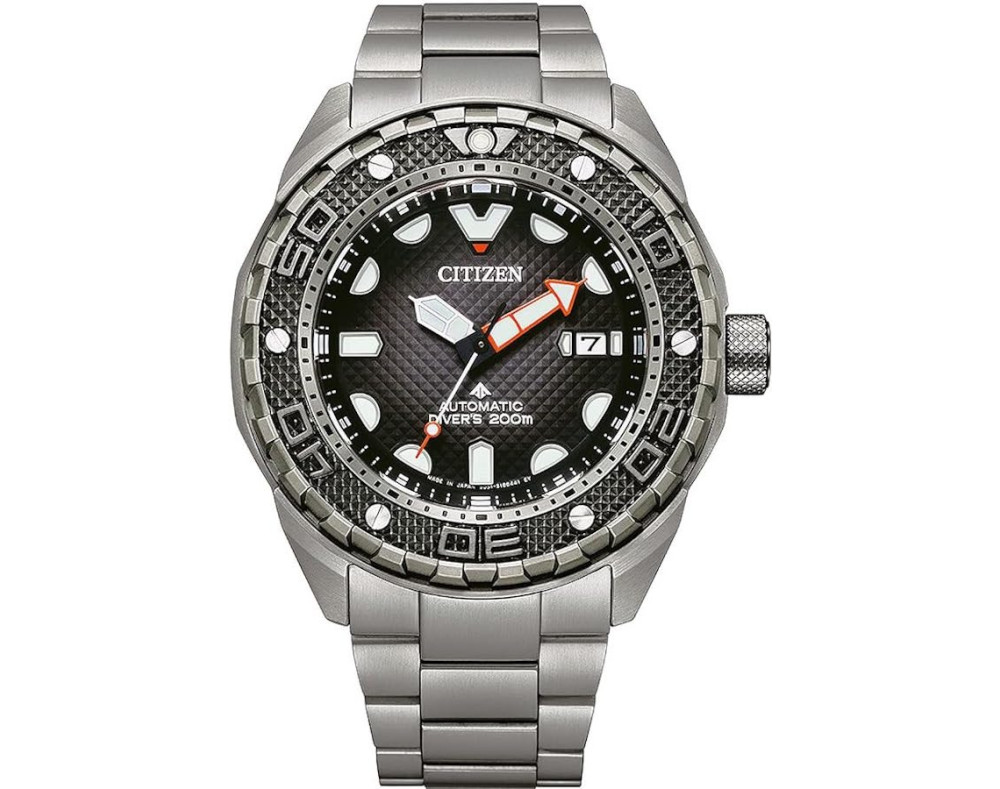 Armbanduhr Citizen Promaster NB6004-83E für Herren mit Mechanisch, Uhrengehäuse aus Titan mit einem Durchmesser von 46 mm, Ziffernblatt Schwarz und Uhrenarmband aus Titan in der Farbe Silber.