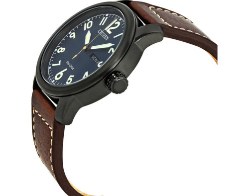 Armbanduhr Citizen Chandler BM8478-01L für Herren mit Quarzwerk, Uhrengehäuse aus Edelstahl mit einem Durchmesser von 42 mm, Ziffernblatt Blau und Uhrenarmband aus Leder in der Farbe Braun.