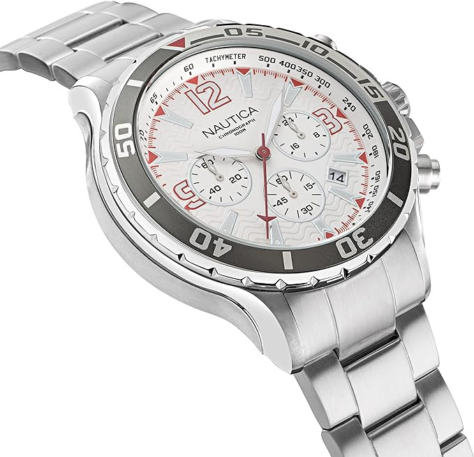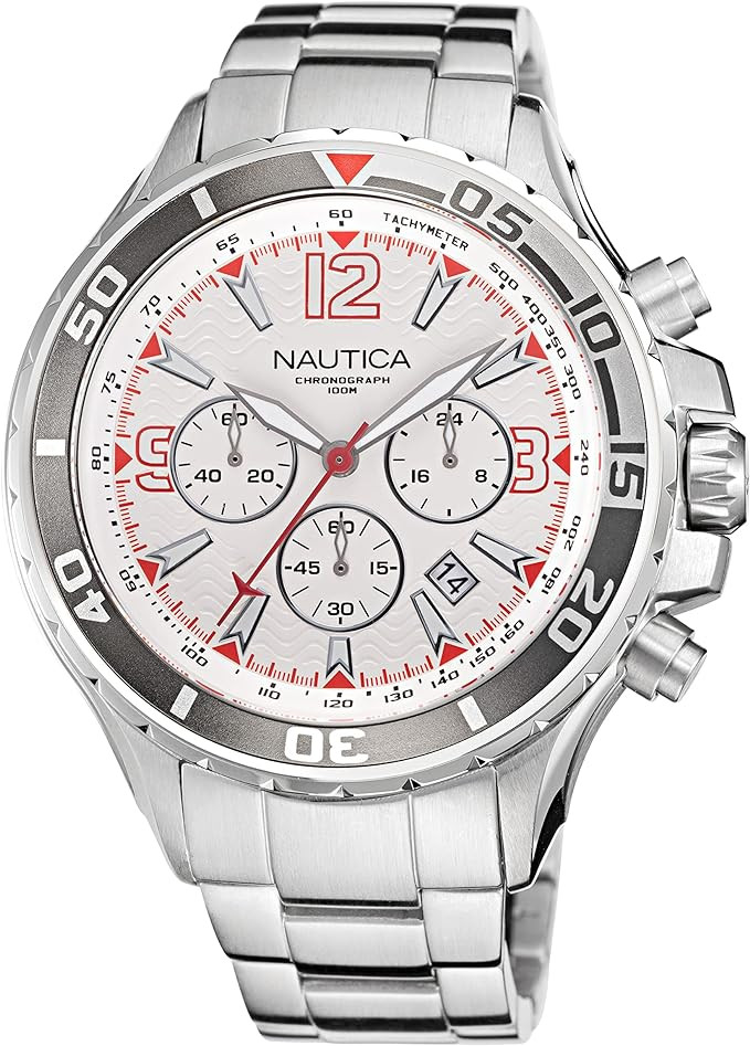 Reloj de pulsera Nautica Key Biscayne NAPNSS218 para Hombre con movimento de Cuarzo, con caja de Acero inoxidable con diàmetro de 49 mm, con cuadrante Blanco y correa en Acero inoxidable, color Plateado.