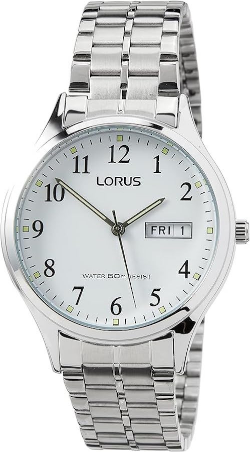 Kvarts Mees Käekell Lorus RXN01DX9, Roostevaba teras korpusega, läbimõõduga 38 mm, Mineraal klaasist, Valge sihverplaadi ja Hõbedane Roostevaba teras rihm.