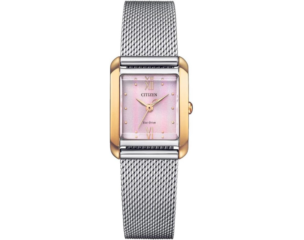 Montre bracelet Citizen Eco-Drive Square EW5596-66X pour Femme à Quartz, avec une boîtier de Acier inoxydable d’un diamètre de 21 mm, avec un cadran Rose et avec un bracelet de Maille milanaise en couleur Argent.