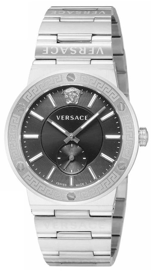 Kvarcas Vyras Rankinis laikrodis Versace VEVI00720 su Nerūdijantis plienas dėklu, 41 mm skersmens, Mineralas su safyru stiklas, Juoda ciferblatu ir Sidabras Nerūdijantis plienas apyranke.