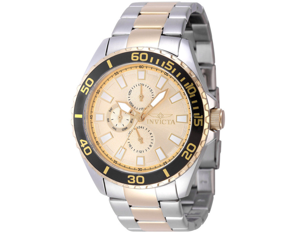 Kvarcas Vyras Rankinis laikrodis Invicta 47579 su Nerūdijantis plienas dėklu, 46 mm skersmens, Mineralinis stiklas, Auksas ciferblatu ir Dviejų atspalvių Nerūdijantis plienas apyranke.