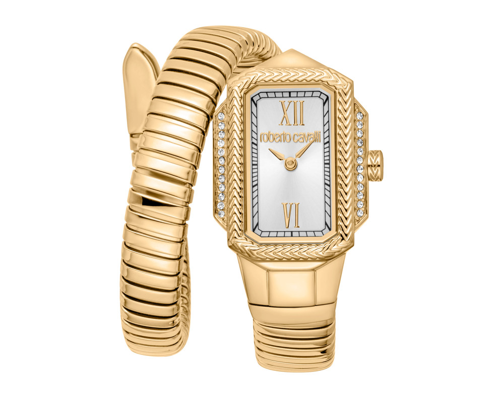 Kvarcas Moteris Rankinis laikrodis Roberto Cavalli RC5L115M0035 su Nerūdijantis plienas dėklu, 22 mm skersmens, Mineralinis stiklas, Sidabras ciferblatu ir Auksas Nerūdijantis plienas apyranke.