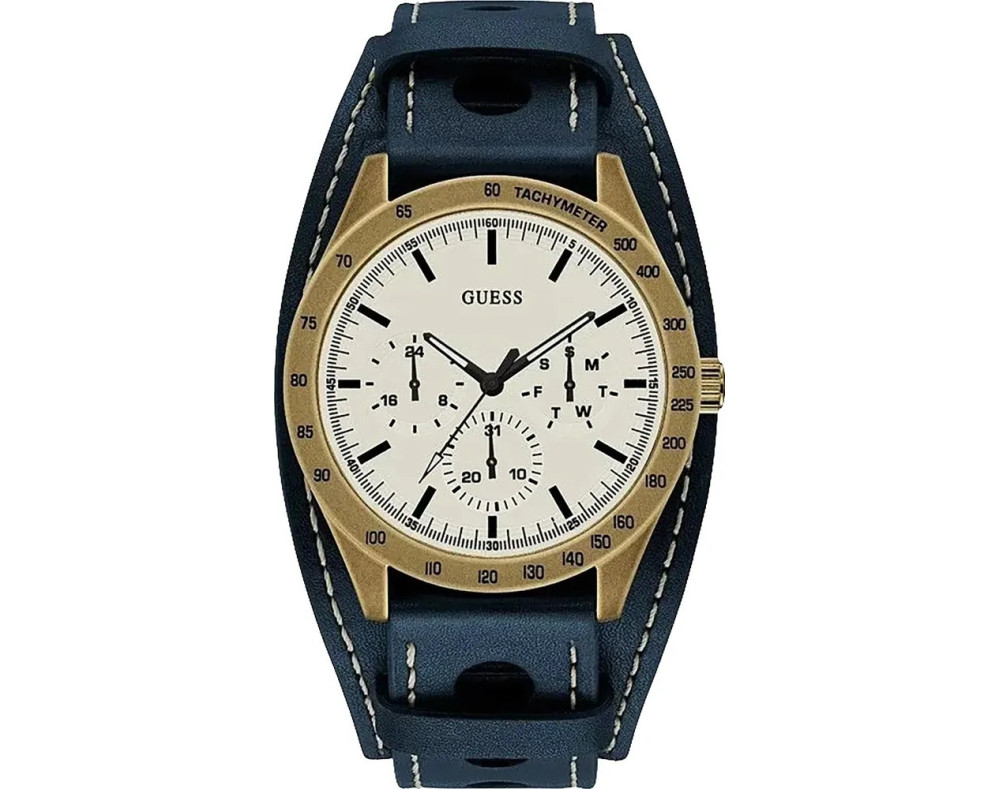 Kvarcas Vyras Rankinis laikrodis Guess W1100G2 su Nerūdijantis plienas dėklu, 44 mm skersmens, Mineralinis stiklas, Baltas ciferblatu ir Mėlyna Oda apyranke.