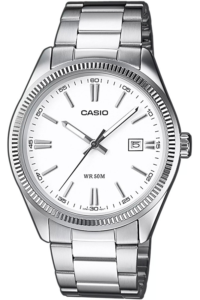 Kvarcs Cilvēks Rokas pulkstenis Casio MTP-1302PD-7A1VEF ar Misiņš korpusu, ar diametru 38 mm, Minerāls stikls, Balts ciparnīcu un Sudrabs Nerūsējošais tērauds siksnu.
