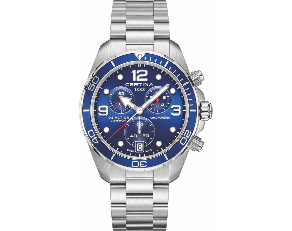 Kvarcs Cilvēks Rokas pulkstenis Certina C032.434.11.047.00 ar Nerūsējošais tērauds korpusu, ar diametru 43 mm, Minerāls ar safīru apstrādi stikls, Zils ciparnīcu un Sudrabs Nerūsējošais tērauds siksnu.