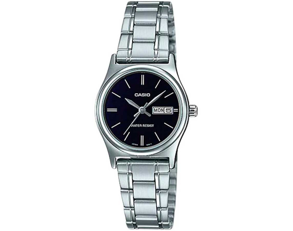 Кварц Женщина Наручные часы Casio LTP-V006D-1B2, корпус Латунь, диаметр 25 mm, Минеральная стекло, Черный циферблат и Серебро Нержавеющая сталь ремешок.