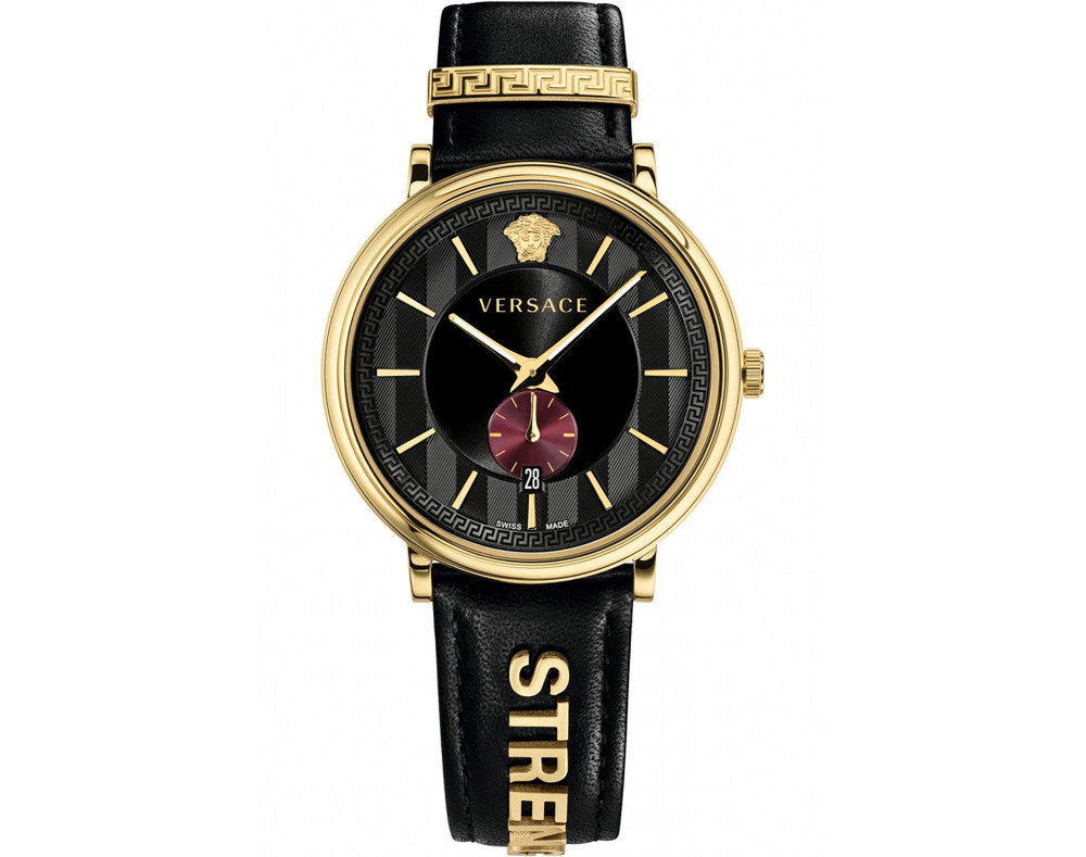 Кварц Мужчина Наручные часы Versace VBQ050017, корпус Нержавеющая сталь, диаметр 42 mm, Минерал с обработкой сапфиром стекло, Черный циферблат и Черный Кожа ремешок.