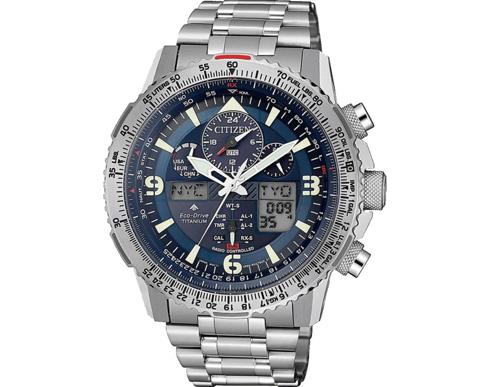 Кварц Мужчина Наручные часы Citizen JY8100-80L, корпус Титан, диаметр 45 mm, Минерал с обработкой сапфиром стекло, Синий циферблат и Серебро Титан ремешок.