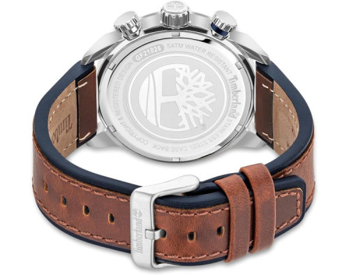 Armbanduhr Timberland Callahan TDWGF2102602 für Herren mit Quarzwerk, Uhrengehäuse aus Edelstahl mit einem Durchmesser von 46 mm, Ziffernblatt Blau und Uhrenarmband aus Leder in der Farbe Braun.