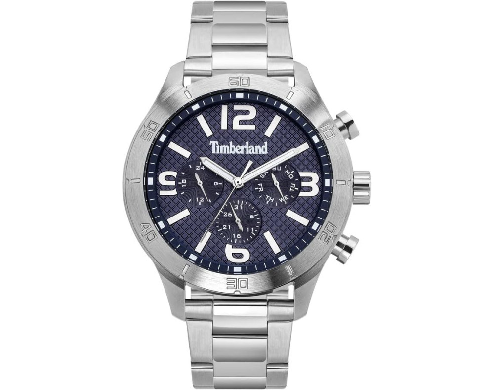 Armbanduhr Timberland Stranton TBL15358JS03M für Herren mit Quarzwerk, Uhrengehäuse aus Edelstahl mit einem Durchmesser von 49 mm, Ziffernblatt Blau und Uhrenarmband aus Edelstahl in der Farbe Silber.