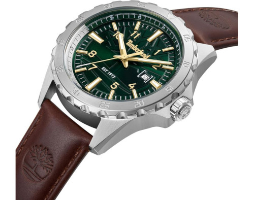 Armbanduhr Timberland Day Pond TDWGB0055801 für Herren mit Quarzwerk, Uhrengehäuse aus Edelstahl mit einem Durchmesser von 45 mm, Ziffernblatt Grün und Uhrenarmband aus Leder in der Farbe Braun.