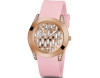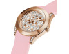 Armbanduhr Guess Clarity GW0109L2 für Damen mit Quarzwerk, Uhrengehäuse aus Edelstahl mit einem Durchmesser von 39 mm, Ziffernblatt Roségold und Uhrenarmband aus Silikon in der Farbe Pink.