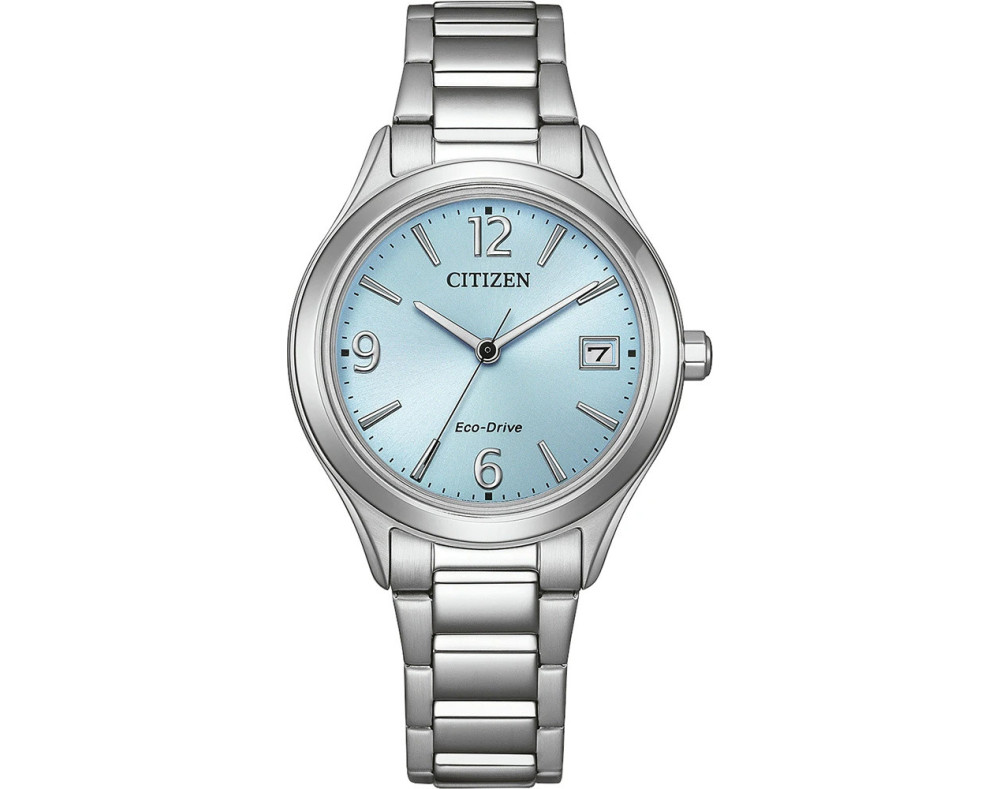 Armbanduhr Citizen Eco-Drive FE6121-67L für Damen mit Quarzwerk, Uhrengehäuse aus Edelstahl mit einem Durchmesser von 34 mm, Ziffernblatt Azurblau und Uhrenarmband aus Edelstahl in der Farbe Silber.