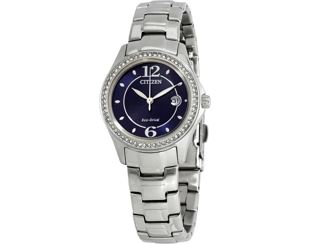 Armbanduhr Citizen Eco-Drive FE1140-86L für Damen mit Quarzwerk, Uhrengehäuse aus Edelstahl mit einem Durchmesser von 30 mm, Ziffernblatt Blau und Uhrenarmband aus Edelstahl in der Farbe Silber.