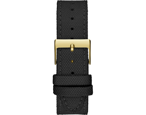 Armbanduhr Guess Shimmer GW0408L2 für Damen mit Quarzwerk, Uhrengehäuse aus Edelstahl mit einem Durchmesser von 39 mm, Ziffernblatt Gold und Uhrenarmband aus Stoff in der Farbe Schwarz.