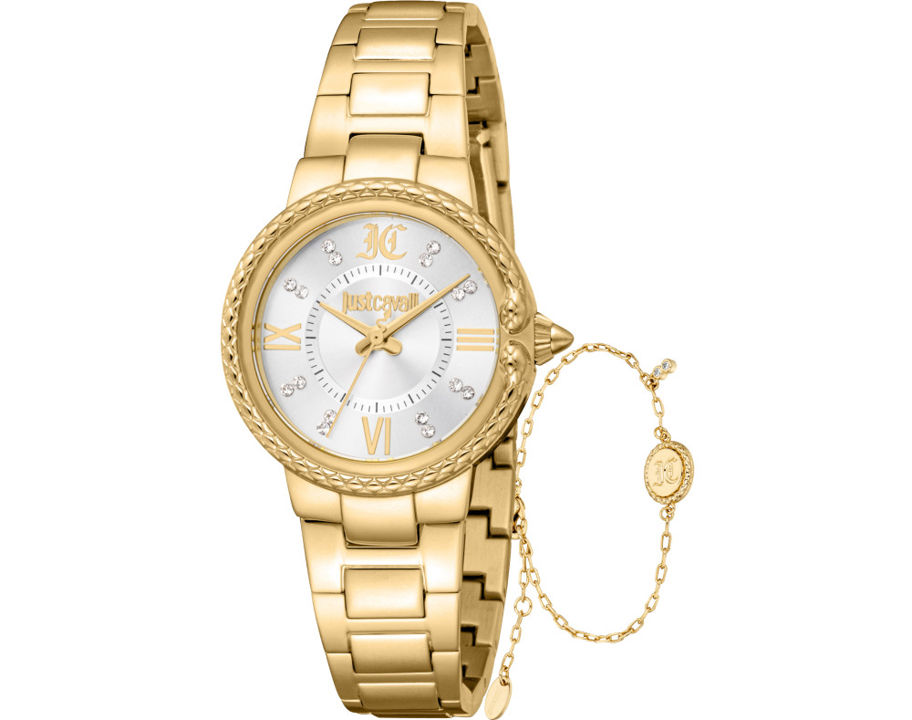 Kvarts Naine Käekell Just Cavalli JC1L378M0045, Roostevaba teras korpusega, läbimõõduga 30 mm, Mineraal klaasist, Hõbedane sihverplaadi ja Kuldne Roostevaba teras rihm.