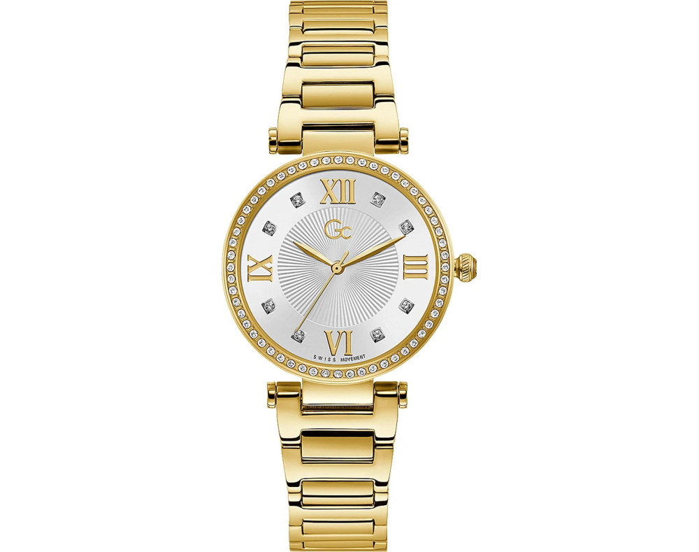 Kvarts Naine Käekell Guess Collection Y64003L1MF, Roostevaba teras korpusega, läbimõõduga 34 mm, Safiiri töötlusega mineraal klaasist, Hõbedane sihverplaadi ja Kuldne Roostevaba teras rihm.
