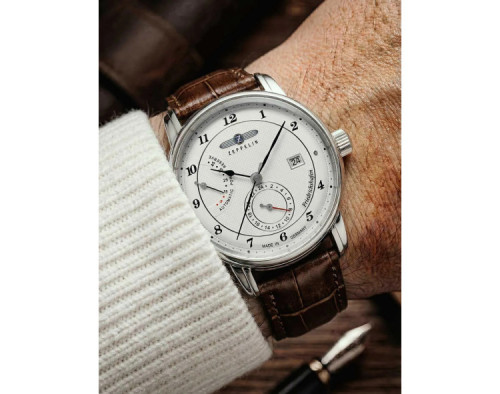 Mehaaniline Mees Käekell Zeppelin 8590-1, Roostevaba teras korpusega, läbimõõduga 42 mm, Mineraal K1 klaasist, Hõbedane sihverplaadi ja Pruun Nahk rihm.
