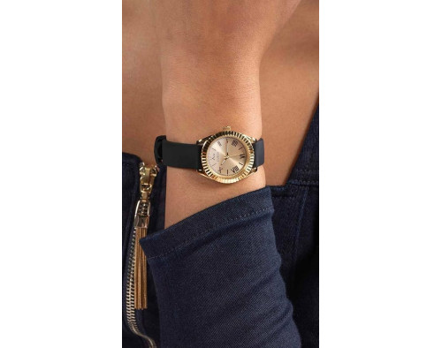 Kvarts Naine Käekell Guess GW0724L2, Roostevaba teras korpusega, läbimõõduga 30 mm, Mineraal klaasist, Kuldne sihverplaadi ja Must Silikoon rihm.