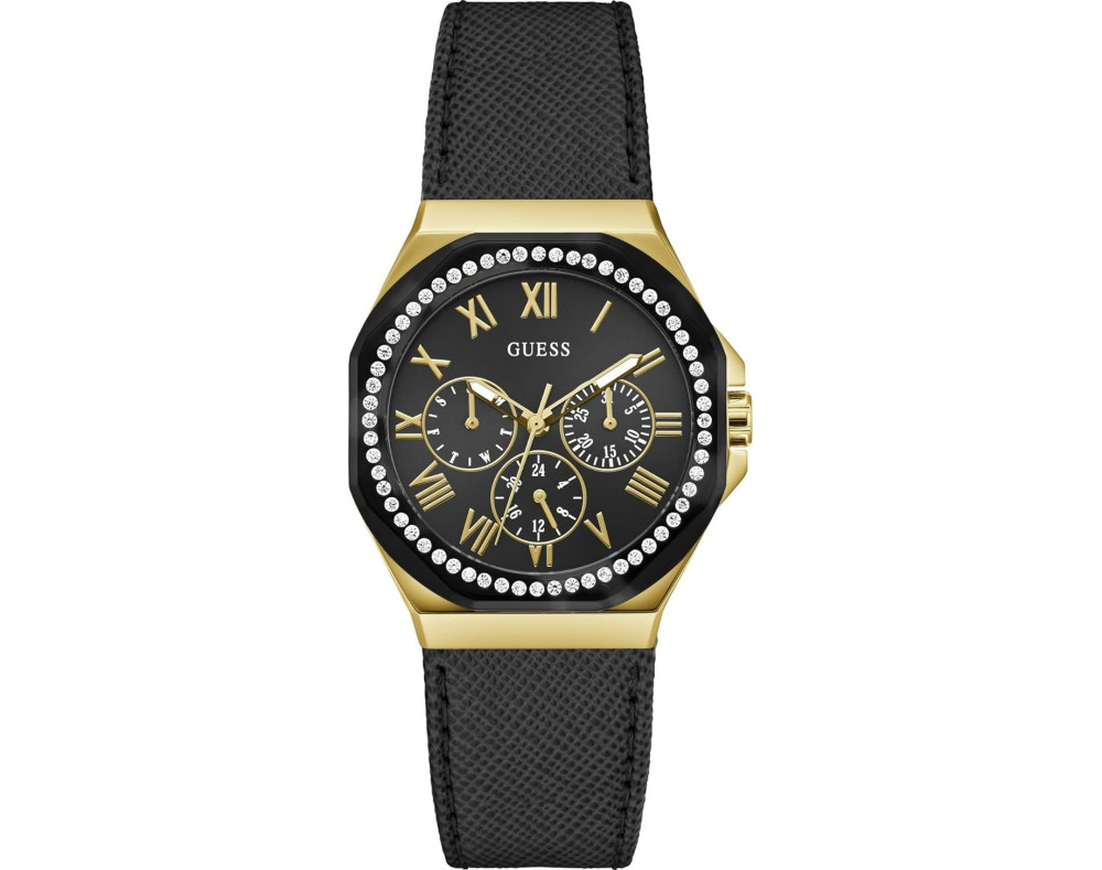 Montre bracelet Guess Glaze GW0753L4 pour Femme à Quartz, avec une boîtier de Acier inoxydable d’un diamètre de 36 mm, avec un cadran Or et avec un bracelet de Cuir en couleur Noir.