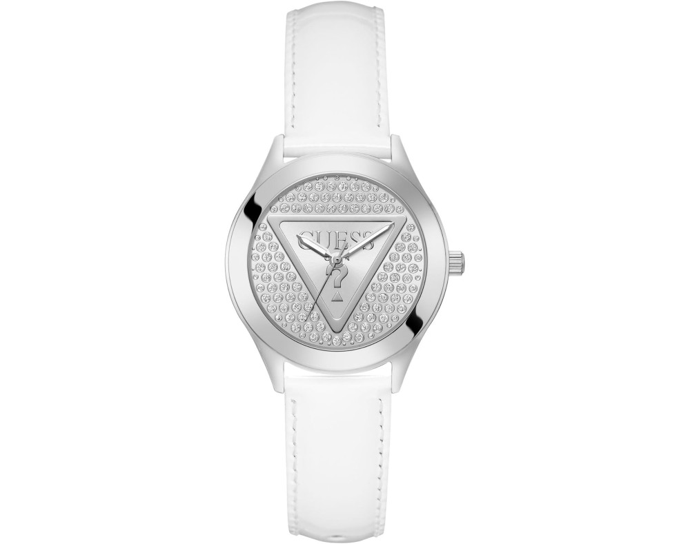 Montre bracelet Guess Glitz Plaque GW0745L3 pour Femme à Quartz, avec une boîtier de Acier inoxydable d’un diamètre de 34 mm, avec un cadran Argent et avec un bracelet de Cuir en couleur Blanc.
