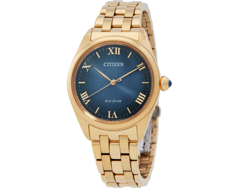 Montre bracelet Citizen Eco-Drive EM1142-84L pour Femme à Quartz, avec une boîtier de Acier inoxydable d’un diamètre de 33 mm, avec un cadran Bleu et avec un bracelet de Acier inoxydable en couleur Or.