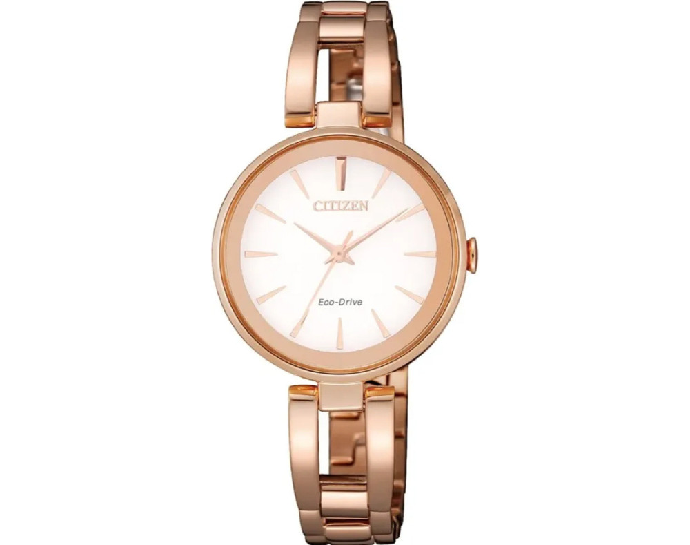 Quartz Womens Wristwatch Citizen Eco-Drive EM0639-81A with Stainless steel case, with diameter 28 mm, White dial and Rose gold Stainless steel band.