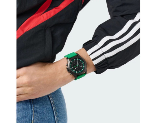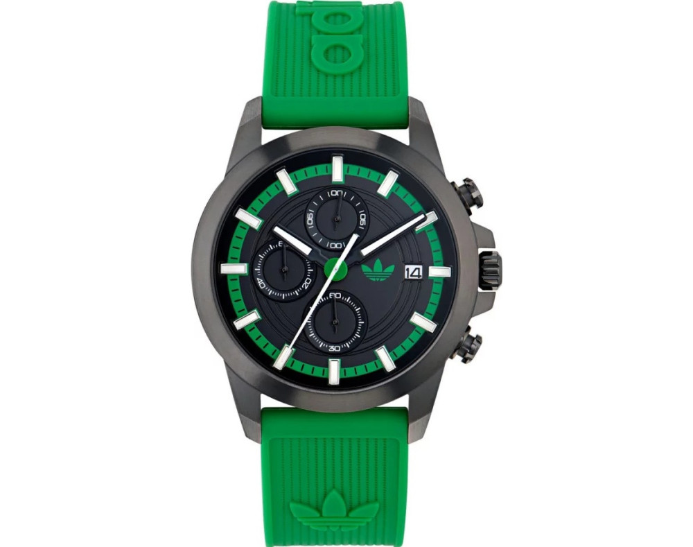 Orologio da polso Adidas Expression Two AOFH24522 Cronografo Unisex con movimento Al quarzo, cassa in Acciaio inossidabile di diametro 43 mm, quadrante Nero, vetro Minerale e cinturino in Silicone di colore Verde.