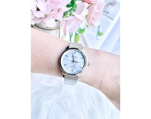 Orologio da polso Citizen EM1150-86D Analogico Donna con movimento Al quarzo, cassa in Acciaio inossidabile di diametro 32 mm, quadrante Madreperla, vetro Minerale con trattamento Zaffiro e cinturino in Maglia milanese di colore Argento.