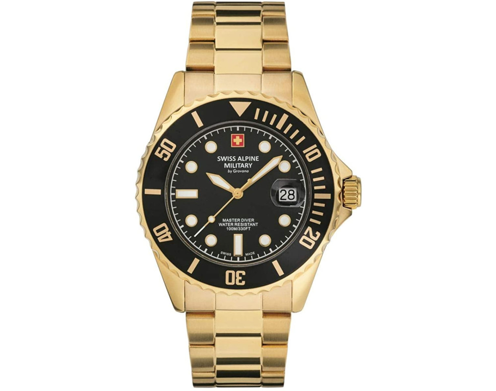 Orologio da polso Swiss Alpine Military Diver 7053.1117 Analogico Uomo con movimento Al quarzo, cassa in Acciaio inossidabile di diametro 42 mm, quadrante Nero, vetro Minerale e cinturino in Acciaio inossidabile di colore Oro.