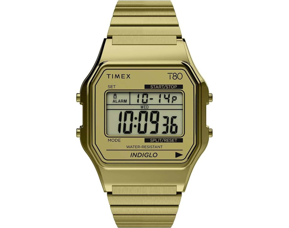 Orologio da polso Timex T80 TW2W68100 Digitale Unisex con movimento Al quarzo, cassa in Acciaio inossidabile di diametro 34 mm, quadrante Oro, vetro Acrilico e cinturino in Acciaio inossidabile di colore Oro.
