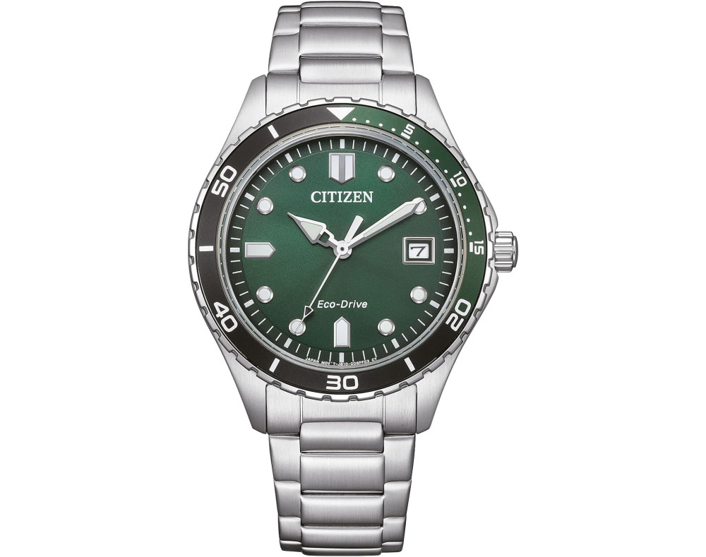Orologio da polso Citizen Eco-Drive Sporty Aqua AW1828-80X Analogico Unisex con movimento Al quarzo, cassa in Acciaio inossidabile di diametro 37 mm, quadrante Verde, vetro Minerale e cinturino in Acciaio inossidabile di colore Argento.