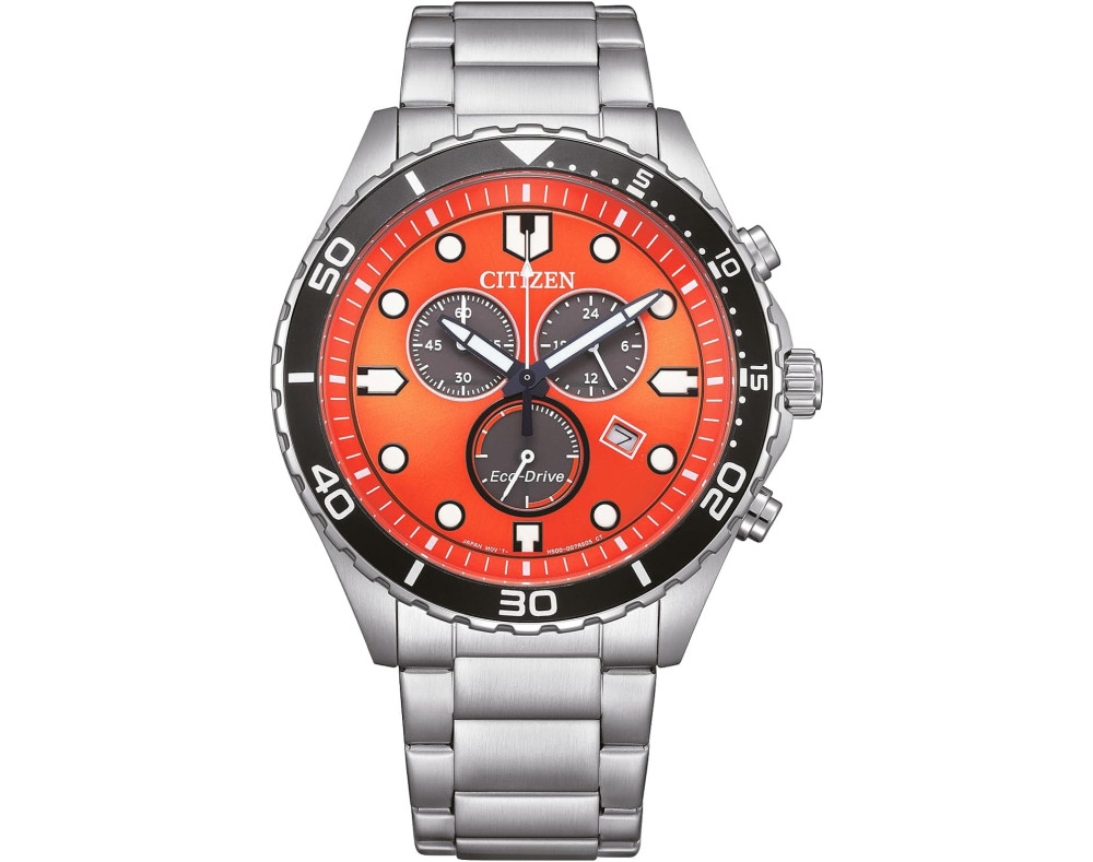 Orologio da polso Citizen Eco-Drive Sporty Aqua AT2560-84X Cronografo Uomo con movimento Al quarzo, cassa in Acciaio inossidabile di diametro 43 mm, quadrante Arancione, vetro Minerale e cinturino in Acciaio inossidabile di colore Argento.