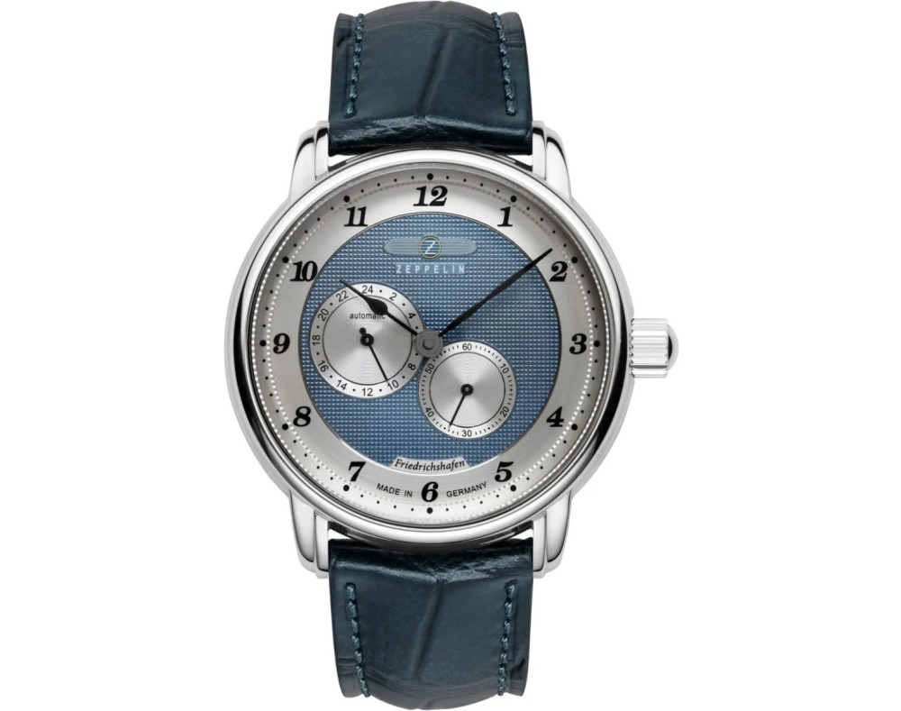 Mechaninis Vyras Rankinis laikrodis Zeppelin 8568-3 su Nerūdijantis plienas dėklu, 40 mm skersmens, Mineralinis K1 stiklas, Dangaus mėlynumo ciferblatu ir Mėlyna Oda apyranke.