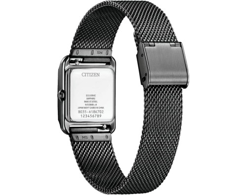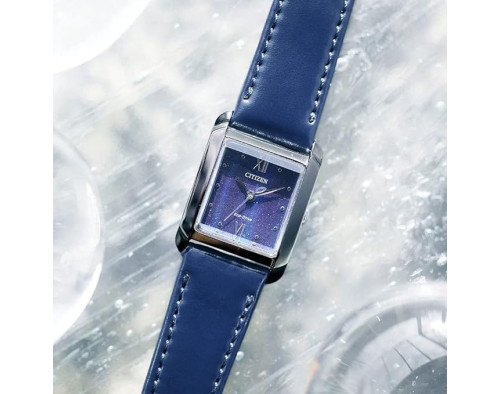 Kvarcas Moteris Rankinis laikrodis Citizen EW5597-63L su Nerūdijantis plienas dėklu, 21 mm skersmens, Mineralas su safyru stiklas, Mėlyna ciferblatu ir Juoda Milano marškinėliai apyranke.