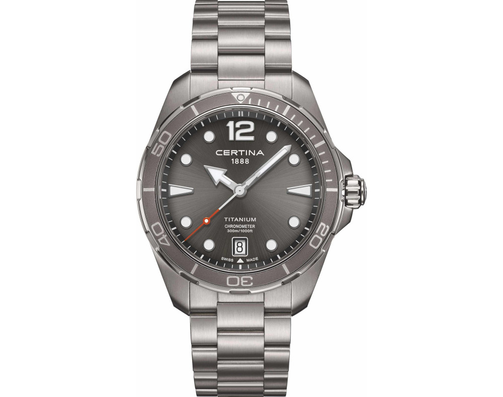 Kvarcas Vyras Rankinis laikrodis Certina C032.451.44.087.00 su Titanas dėklu, 43 mm skersmens, Mineralas su safyru stiklas, Pilka ciferblatu ir Pilka Titanas apyranke.